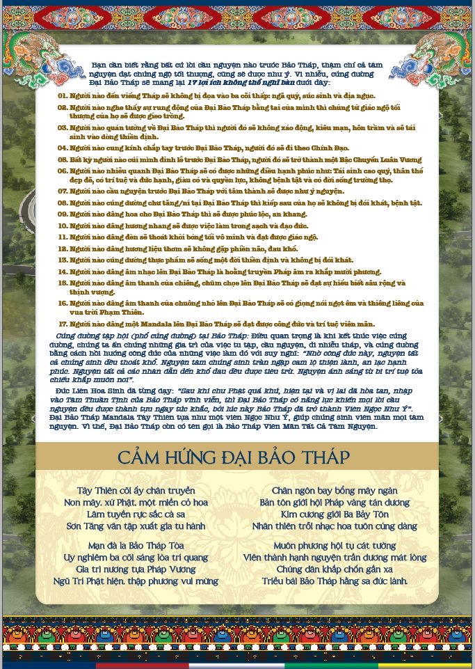 Bạn cần biết rằng bất cứ lời cầu nguyện nào trước Bảo Tháp, thậm chí cả tâm nguyện đạt chứng ngộ tối thượng, cũng sẽ được như ý. Vi nhiễu, cúng dường Đại Bảo Tháp sẽ mang lại 17 lợi ích không thể nghĩ bàn dưới đây: