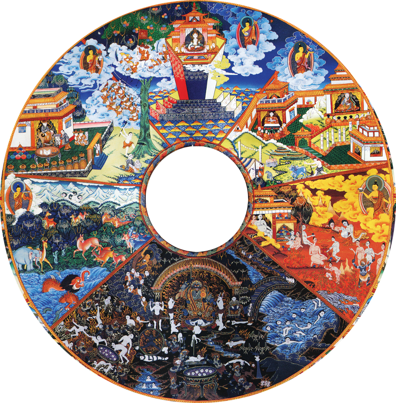 Cõi trời vui vẻ hơn nhân gian nhưng sáu căn ngày đêm gây mê, khó tỉnh, khiến nỗi khổ ngu si sa đọa càng nặng nề. Cõi A-tu-la nhọc nhằn vì tranh cãi gây gổ. Bàng sinh ăn tươi nuốt sống lẫn nhau. Gà vịt chịu phanh thây xé thịt. Ngựa trâu chở nặng kéo xa. Ngã quỷ đói khát miệng phực ra lửa. Địa ngục thì vạc dầu rừng đao...