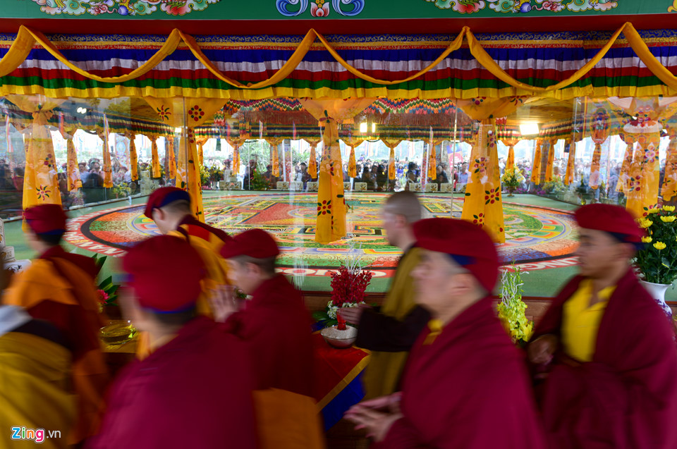 Trong buổi lễ, Đức Pháp vương Gyalwang Drukpa cùng Tăng đoàn đã đi vòng quanh bức tranh Mandala để mang đến sự gia trì của Đức Phật Quan Âm.