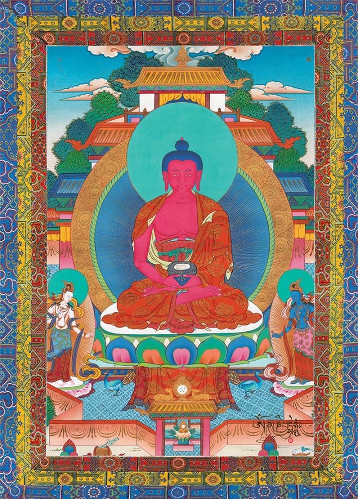 Đức Phật A Di Đà được mọi người biết đến về năng lực trường thọ, hành uẩn, sắc đỏ, nhận thức thanh tịnh và trí tuệ chứng ngộ Tính không của vạn pháp. Trì tụng chân ngôn A Di Đà giúp trưởng dưỡng lòng bi mẫn, tịnh hóa các ác nghiệp, và khai mở tình yêu thương rộng lớn vô điều kiện hướng đến mọi hữu tình, nhờ đó tiêu trừ được chấp ngã. Chân ngôn sáu âm “OM AH MI DEWA SHRI”, tiếng Việt phiên âm là “Nam Mô A Di Đà Phật” của Đức A Di Đà nêu biểu Lục độ Ba la mật, pháp đối trị với sáu xúc tình phiền não.