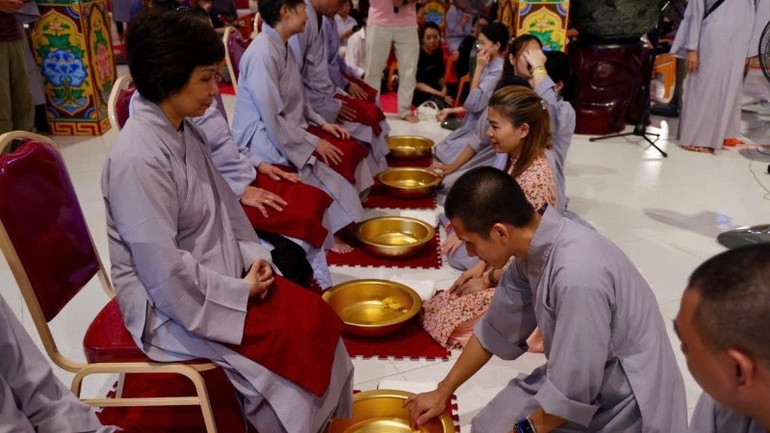 Một trong những khoảnh khắc xúc động nhất mùa Vu Lan ở Mandala Tây Thiên là nghi thức rửa chân cha mẹ. Những người con ở nhiều lứa tuổi, từ thiếu niên đến trưởng thành, quỳ dưới chân cha mẹ, nâng niu bàn chân đã chai sạn qua tháng năm. Mỗi giọt nước ấm hôm nay là tình yêu thương, mỗi động tác lau rửa là sự tri ân sâu sắc.