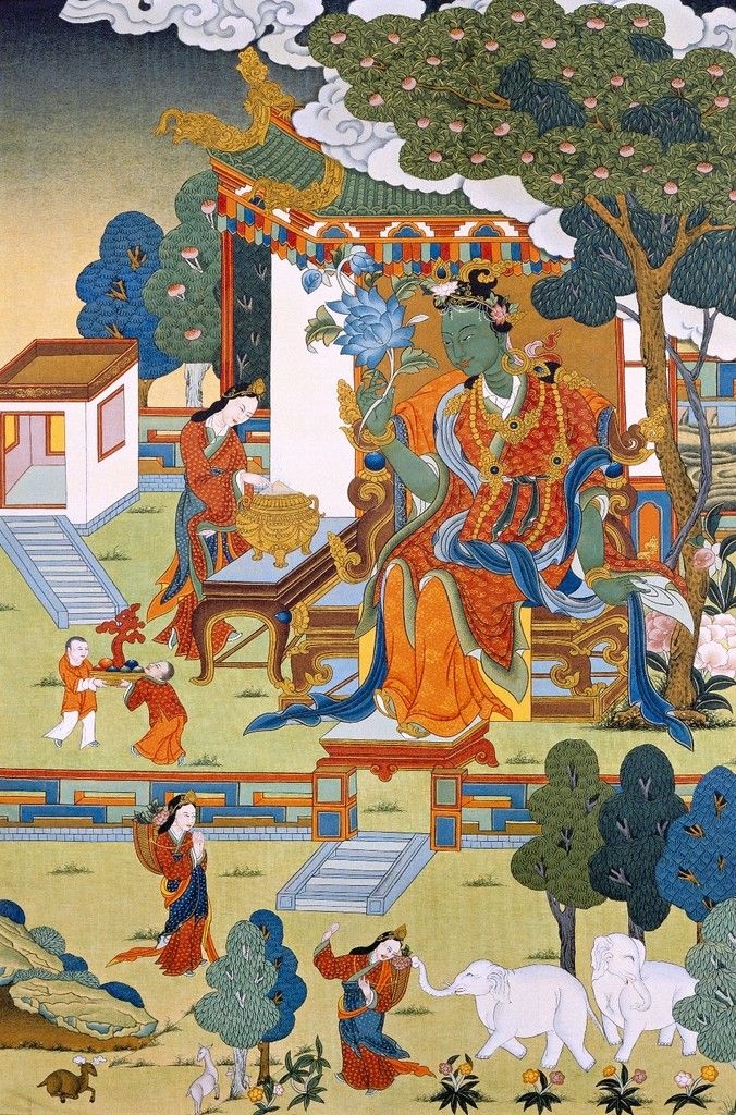 Vô số kiếp trong một cảnh giới khác, có một công chúa tên là Yeshe Dawa. Nhờ sự học và trí tuệ của mình, nàng có lòng tin kiên cố với Ba ngôi Tam Bảo Phật, Pháp, Tăng. Nàng thấu hiểu đời sống bất như ý của bản chất luân hồi, do vậy nàng quyết định giải thoát khỏi tất cả mọi đau khổ. Do thấu hiểu tất cả chúng sinh cũng giống như mình đều muốn hạnh phúc và không muốn đau khổ nên Công chúa Yeshe Dawa đã trưởng dưỡng lòng từ bi và tình yêu thương hướng về mỗi chúng sinh. Nàng không thích lối sống xa hoa trong cung điện vàng ngọc, và đã phát lời nguyện dẫn dắt hướng đạo cho hàng nghìn chúng sinh trên con đường giải thoát mỗi ngày trước bữa ăn sáng, cho hàng nghìn chúng sinh trước bữa ăn trưa, và thậm chí nhiều hơn nữa trước khi đi ngủ. Vì nhân duyên này, công chúa được tôn xưng là Arya (Bậc tôn quý) có nghĩa là Ngài có thể chứng ngộ trực tiếp bản chất của thực tại và danh xưng đó biểu lộ các hạnh nguyện giải thoát của Ngài.