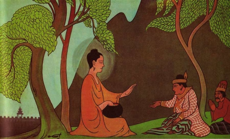 - Sa-môn hãy cùng về với trẫm đi, trẫm sẽ chia cho sa-môn một nửa giang sơn, cả hai ta sẽ cùng nhau cai trị và hưởng phúc. Ít chục năm sau, khi tuổi già, sức yếu, mọi lạc thú trên đời đều đã nhàm chán thì cứ giao lại hết cho trẫm, rồi đi xuất gia cũng chưa muộn gì.