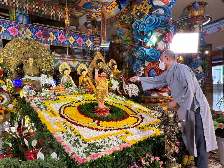 Buổi lễ diễn ra trong trọn vẹn sáng ngày Rằm tháng Tư (15/5) cùng với nhiều nghi lễ Phật giáo đầy đạo vị: vi nhiễu Bảo tháp, cúng dàng nước tắm Phật, dâng hương hoa lễ Tam bảo, đọc tụng kinh sách ngợi ca về cuộc đời và công hạnh của Đức Phật, pháp tu trì Phật Bản tôn và Pháp hội cúng dàng hợp nhất từ bi và trí tuệ.
