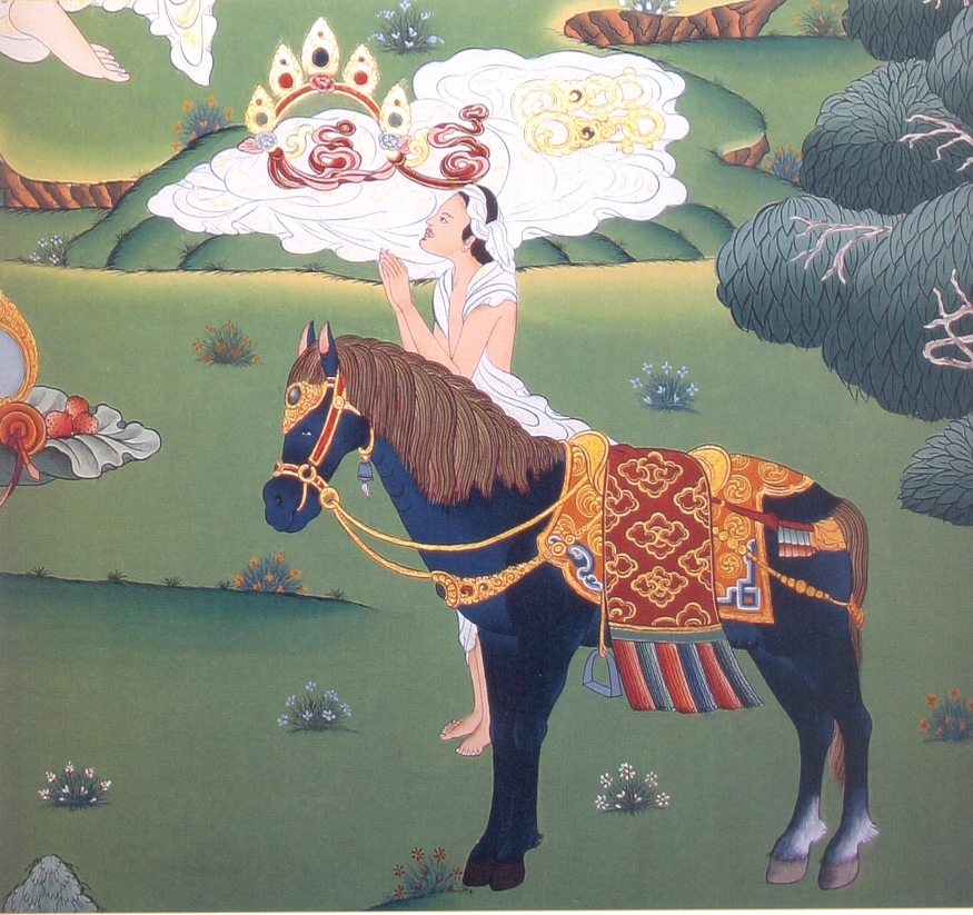 Thái tử Tất Đạt Đa đi 12 dặm từ thành Ca Tỳ La Vệ về phía Đông, theo hướng về Chorten Namdagdrung, nơi một nghìn Đức Phật của Hiền Kiếp này đều sẽ đến để cắt bỏ mái tóc và xả ly mọi luyến ái thế gian. Khi đến gốc cây bên cạnh một bảo tháp, Thái tử xuống ngựa. Ngài vô cùng hoan hỷ khi đến nơi này, Ngài đã tháo bỏ tất cả hoàng phục và đồ trang sức với nụ cười viên mãn. Sau đó, tay phải cầm gươm, tay trái cầm tóc, Ngài cắt phăng mái tóc đen mượt của mình. Khi Ngài ném những lọn tóc lên bầu trời, Đế Thích Thiên Vương đã bắt lấy và mang tất cả tóc Ngài về cõi thiên như những linh vật ban gia trì. Để ghi nhớ thánh địa này, dân chúng trong vùng cùng Đế Thích Thiên Vương, sau đó đã dựng nên Bảo tháp thứ hai tại đây, bên trong Bảo tháp còn lưu giữ một số di vật như hoàng bào và tóc của Thái tử.