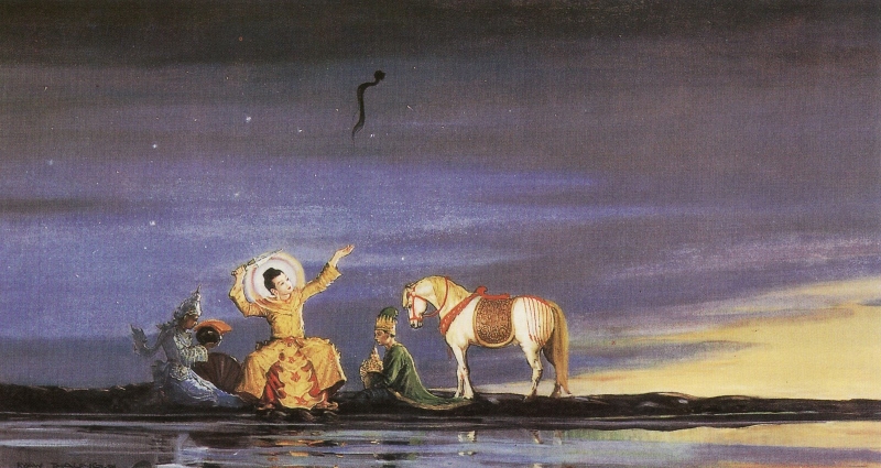Một lát sau, Sakyanama, một cận thần thân tín của Thái tử, giật mình tỉnh giấc, thoáng thấy một tia sáng trên bầu trời và tưởng đó là mặt trăng. Nhưng khi dụi mắt nhìn lại lần nữa, anh ta nhận ra đó không phải mặt trăng mà là Thái tử Tất Đạt Đa đang trên con đường xuất gia tìm đạo. Anh ta cầu xin Thái Tử hãy ở lại và lớn tiếng khóc than: “Xin Ngài đừng từ bỏ cuộc sống hoàng gia, đừng từ bỏ hàng nghìn phi tần và hoàng tộc, và trên hết, xin Ngài đừng phá vỡ ước mơ của Phụ vương Ngài.”