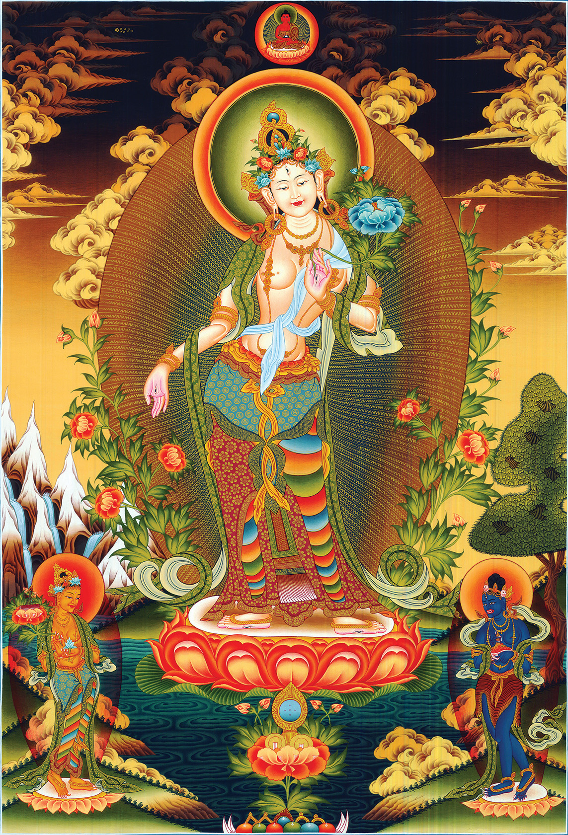 Xét về tự tính tuyệt đối, các Bậc Giác ngộ không rời Pháp thân, nhưng với lòng từ bi, các Ngài thị hiện vố số hình tướng các Báo thân và Hóa thân để chúng sinh có thể kết nối và được lợi ích. Các Ngài sẽ hóa thân thị hiện tùy thuận theo nhu cầu và căn cơ của chúng sinh. Từ Pháp thân, đức Phật A Di Đà hóa hiện Báo thân là đức Phật Quan Âm, và Hóa thân là Đức Liên Hoa Sinh.