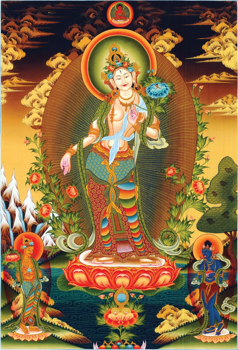 Ví dụ, Đức Lục Độ Mẫu Tara nêu biểu cho lòng từ bi của mười phương ba đời chư Phật. Ngài an tọa trên tòa sen nguyệt luân. Tư thế vũ điệu du hý của Ngài tự do, cởi mở và thân thiện, chân phải của Ngài duỗi xuống chỉ ra sự sẵn sàng bước xuống cõi luân hồi để cứu giúp chúng sinh vô minh. Bàn chân phải của Ngài thường được mô tả đang an tọa trên một tòa sen khác ở phía dưới. Trong cả hội họa và điêu khắc, những cánh hoa sen thường được xếp thành nhiều lớp để biểu lộ sự khai mở theo thứ lớp của loài hoa này khi nở. Rất nhiều cánh hoa được xếp một cách đều đặn và có thể được mạ vàng để tăng thêm vẻ đẹp thuần khiết thanh tịnh vốn có của hoa sen.