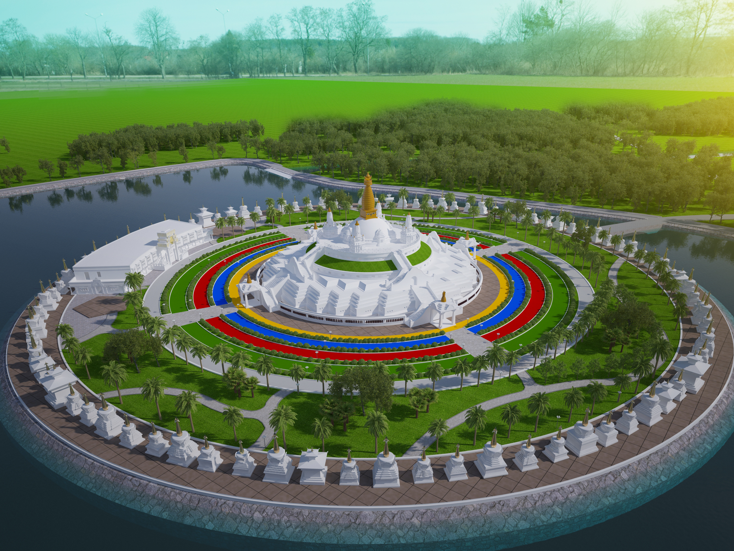 Bao quanh vòng trong hồ là 108 Bảo tháp thiết lập xung quanh như bức tường rào, đây chính là vòng hộ trì làm ranh giới cho khuôn viên tháp với thế giới phàm bên ngoài. Các tháp này nêu biểu “Bát tướng thành đạo” hay các công hạnh quan trọng của Đức Phật từ khi Ngài đản sinh cho đến khi thể nhập Niết bàn.