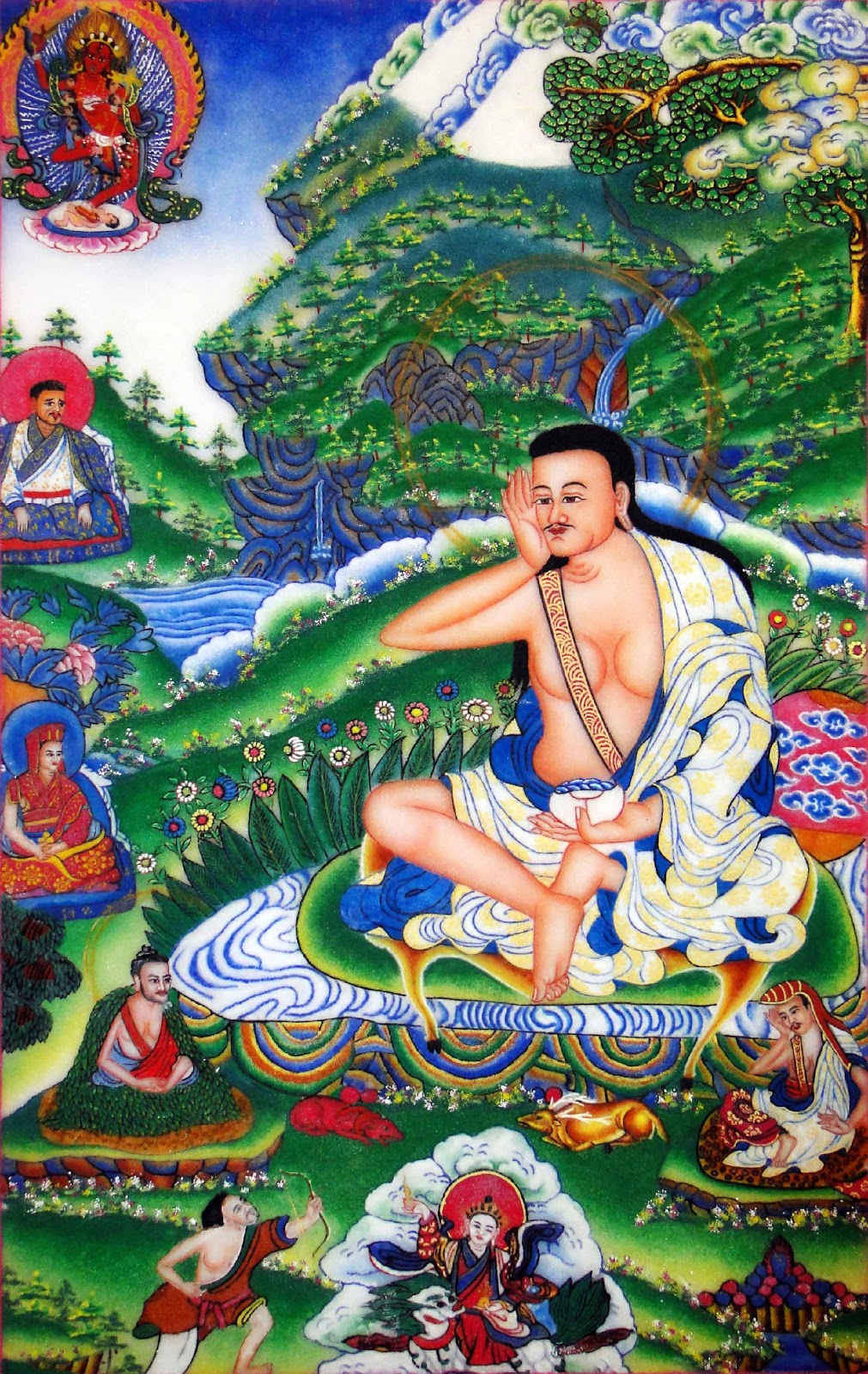 Ngài là Đại Thành tựu giả Milarepa (1052-1135). Ngài đản sinh ở tỉnh Gungthang, miền tây Tây Tạng, trong gia đình của một địa chủ là Mila Sherab Gyaltsen. Khi Milarepa lên bảy tuổi, cha của Ngài lâm trọng bệnh và qua đời, để lại gia sản cho cô và chú của Ngài với lời hứa họ sẽ chăm sóc mẹ con Milarepa, và hoàn trả lại gia sản cho Milarepa và em gái của Ngài ở tuổi trưởng thành.