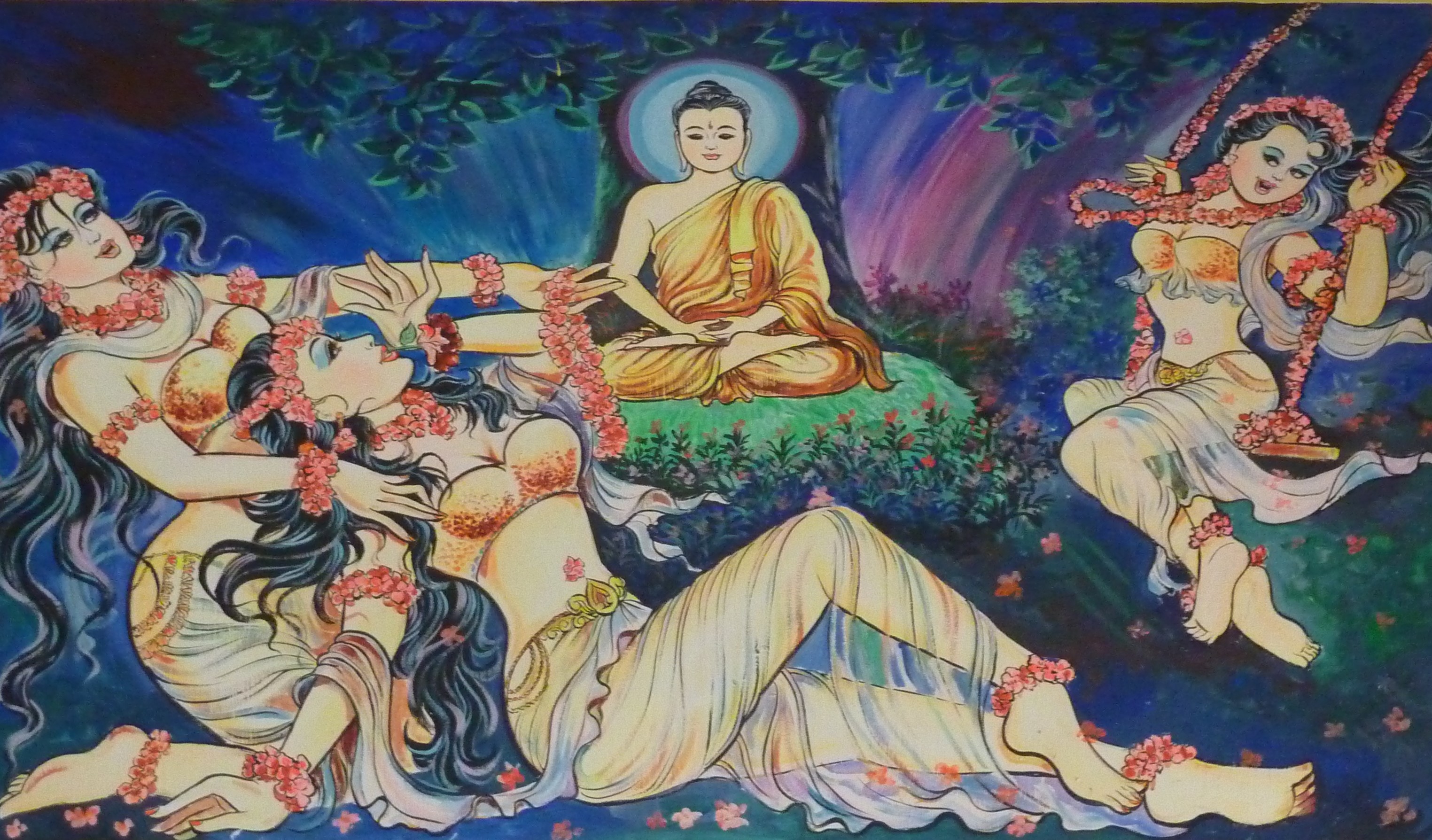 Đầu tiên, Ma Vương phái ba người con gái xinh đẹp, dẫn dầu bởi Sundari, Tradema và Devi, đến làm xao lãng việc thực hành thiền định của Bồ Tát. Chúng trêu trọc Ngài, nhảy múa khêu gợi, nhưng Bồ Tát Tất Đạt Đa không hề khởi tâm ham thích, mà chỉ thấy tràn đầy lòng từ bi thương xót. Càng về đêm, cơ thể trẻ trung, xinh đẹp mà họ vốn tự hào, dần trở nên khô héo già cỗi. Các cô trở nên xấu xí và đáng ghê tởm đến mức tự mình cảm thấy khiếp sợ khi nhìn thấy làn da trần trụi và thân thể gầy trơ xương. Tâm họ trào dâng niềm hổ thẹn và họ bỏ chạy về nhà.