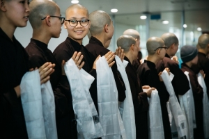 Tăng ni cầm sẵn trên tay những chiếc khăn Khata chờ ban...