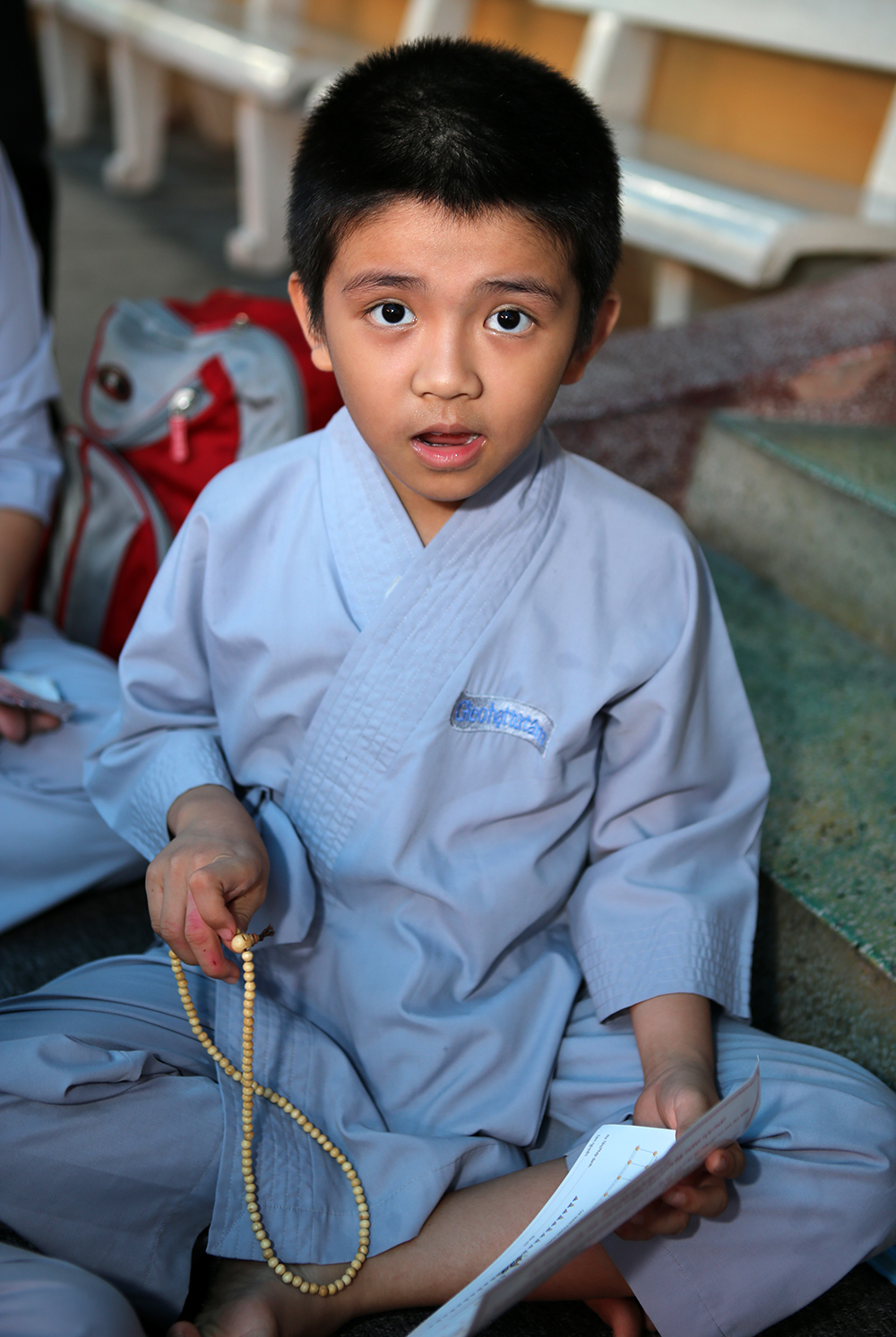 Phật tử nhí Tăng Hoàng Khải - Pháp danh Huệ Khải, dù chỉ mới 7 tuổi nhưng đã rất chăm chỉ, tranh thủ thời gian ngay tại Pháp hội để trì được 4 tràng Chân ngôn. Tâm nguyện của cháu là sẽ trở thành một học trò giỏi, vâng lời thầy cô và cha mẹ.
