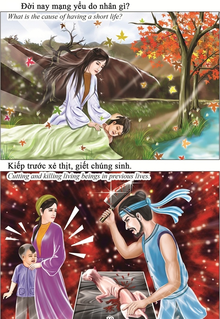 Vì thế Phật dạy: “Giả sử được ăn các món rau quả còn tưởng tượng như trong đời đói khát phải ăn thịt con, huống là ăn cá thịt”. Phật lại dạy: “Vì lợi giết chúng sinh, lấy tiền mua thịt cá, cả hai đều là ác nghiệp, sau chết đọa vào địa ngục rên siết”. Vì thế nên biết giết hại loài vật và lấy thịt ăn, tội sâu như sông biển, nặng như gò núi. Song từ vô thủy đến nay, chúng ta vì không được gặp bạn lành nên mới tạo những nghiệp ấy. Kinh dạy: “Tội giết hại thường làm chúng sinh đọa vào địa ngục, ngã quỉ để chịu khổ báo. Nếu đầu thai trong loài súc sinh phải chịu làm thân hùm, beo, chó sói, bồ cắt, hoặc làm thân rắn độc, rết độc, ôm lòng hiểm ác, hoặc làm thân hươu nai, thỏ beo, luôn luôn sợ hãi. Nếu được làm người, mắc phải hai thứ quả báo: Một là nhiều bệnh, hai là chết yểu.