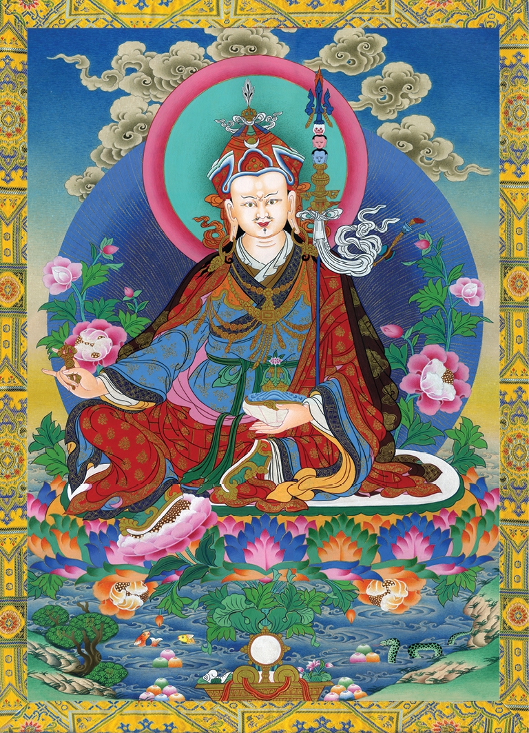 Liên Hoa Sinh Thương sư là một Đại thành tựu giả giác ngộ Ấn Độ. Là hoá hiện Thân, Khẩu, Ý Kim Cương Tam Mật của Đức Phật Di Đà, Quán Âm, Thích Ca. Ngài có một mặt, hai tay, thân sắc hồng, khoác ba loại Pháp y tiêu biểu cho sự thành tựu Tam thừa. Ngài đội mũ Liên Hoa màu vàng trên có nhật, nguyệt luân, đỉnh mũ có đầu Chày Kim Cương và Lông chim Khổng tước nêu biểu cho sự chuyển hoá tất cả si ám. Tay phải nắm giữ Chày Kim Cương nêu biểu cho trí tuệ hàng phục chướng ma. Tay trái cầm Bát sọ người đựng đầy cam lộ nêu  biểu cho sự trường thọ bất tử, cây tích trượng biểu trưng cho Bi Trí hợp nhất.