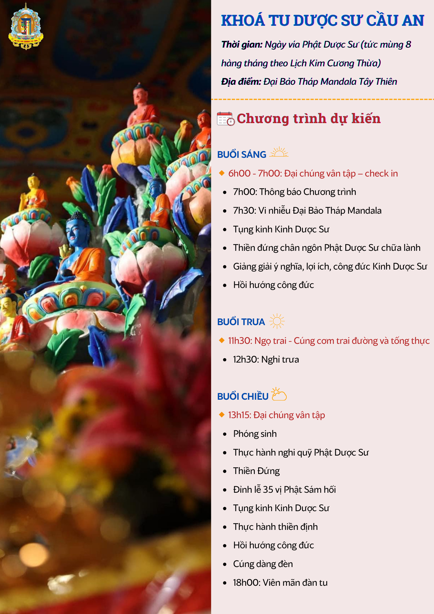 Thời gian: Chủ Nhật, ngày 14/07/2024 - tức ngày vía Phật Dược Sư, mùng 8 theo lịch Kim Cương Thừa