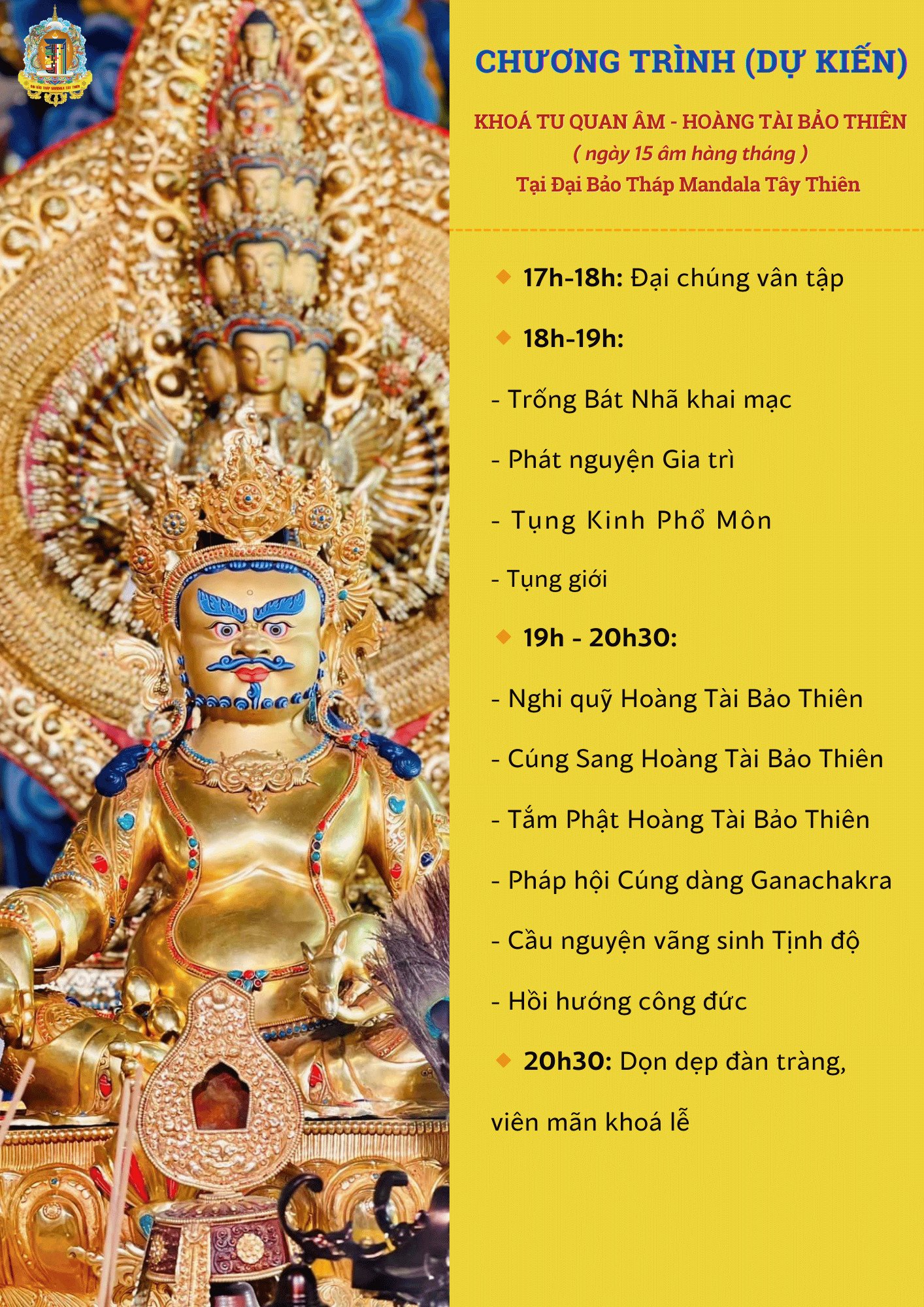 Khóa tu QUAN ÂM - HOÀNG TÀI BẢO THIÊN được tổ chức định kỳ vào ngày Rằm hàng tháng tại Đại Bảo Tháp Mandala Tây Thiên