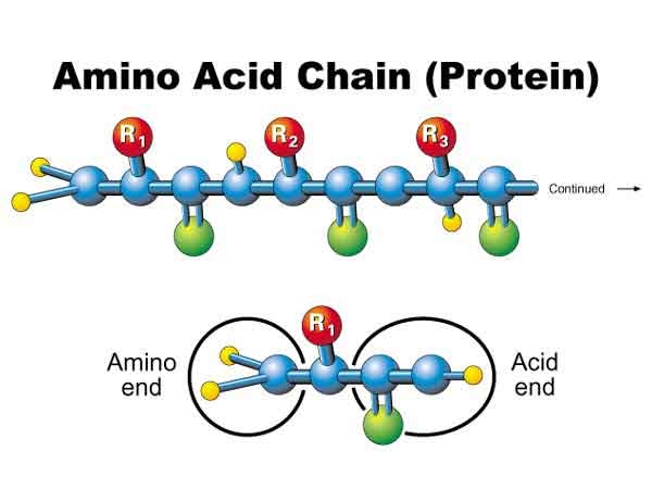 Protein được tạo thành từ chuỗi 20 Axit amin khác nhau kết nối với nhau với thứ tự khác nhau –  tương tự như tất cả các từ trong một từ điển được làm từ 26 chữ cái. Thực vật và vi sinh vật có thể tổng hợp tất cả các axit amin riêng biệt được sử dụng để xây dựng các Protein, nhưng động vật thì không thể. Có 8 xit amin mà con người không thể tự tạo ra và do đó, phải lấy từ chế độ ăn, thành ra được gọi là “thiết yếu”.