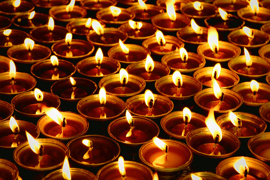 Thời Đức Phật tại thế, có một bà cụ già đến lễ Phật và sau khi thọ nhận giáo pháp của Ngài, bà bỗng khởi lên niềm kính tín tột cùng. Bởi bà rất nghèo, bà chỉ có đủ tiền để mua một ngọn đèn cúng dường Đức Phật. Khi cúng dường, bà phát nguyện rằng: «Xin hồi hướng công đức cúng dường đèn lên chư Phật và chư Bồ Tát không phải cho hạnh phúc của bản thân tôi. Trong tương lai, tôi xin nguyện dứt trừ vô minh vì lợi ích của tất cả chúng sinh hữu tình. Nhờ dứt trừ vô minh của tất cả chúng sinh, tôi nguyện có thể mang lại hạnh phúc tối thượng cho họ. Tôi xin nguyện chịu khổ đau thay cho tất cả chúng sinh mẹ». Với nguyện lực mạnh mẽ và thanh tịnh, ngọn đèn của bà cụ cháy liên tục trong suốt bảy ngày, không hề bị tắt. Một vị A-la-hán là đệ tử của Đức Phật thầm nghĩ: «Ngọn đèn đã cháy quá lâu rồi. Giờ ta phải chuẩn bị cho thời giảng pháp sau và không cần đến đèn nữa». Nhưng dù vị A-la-hán dùng đủ mọi cách cũng không thể làm ngọn đèn tắt. Lúc đó, Đức Phật mới dạy rằng : «Nếu con không cúng dường ngọn đèn đó, con sẽ không thể dập tắt được nó. Ngọn đèn của bà cụ được cúng dường với Bồ đề tâm thanh tịnh, trong sáng và vô nhiễm. Nhờ công đức cúng dường của một ngọn đèn với tâm từ bi, trong tương lai bà cụ đó sẽ là Đức Phật Ánh Sáng».