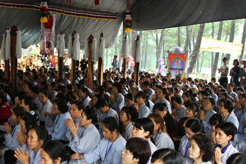 Y theo lời khai thị của Quý Thầy, bất kể trời gió hắt mưa tuôn suốt buổi sáng khiến mọi người phải ngồi nép vào nhau, dù thân lạnh áo ướt cũng vẫn cố che cho kinh sách, tiếng kinh Phật khai thị vẫn nhịp nhàng và âm vang suốt buổi trưa. Rồi trời nản thôi mưa, nắng lên cao sấy khô sân gạch và bắt đầu hun nóng bầu khí xung quanh như thử thách lòng người, những lời kinh vẫn miệt mài bền bỉ không hề ngưng nghỉ. Đến hơn một giờ chiều, khi khóa lễ Địa Tạng Vương theo truyền thống Đại thừa viên mãn trong niềm hoan hỷ của đại chúng, đất trời cũng như dịu đi với những làn gió mát nhẹ, cây cối như xanh tươi hơn để tùy hỷ công đức đoàn hành hương.