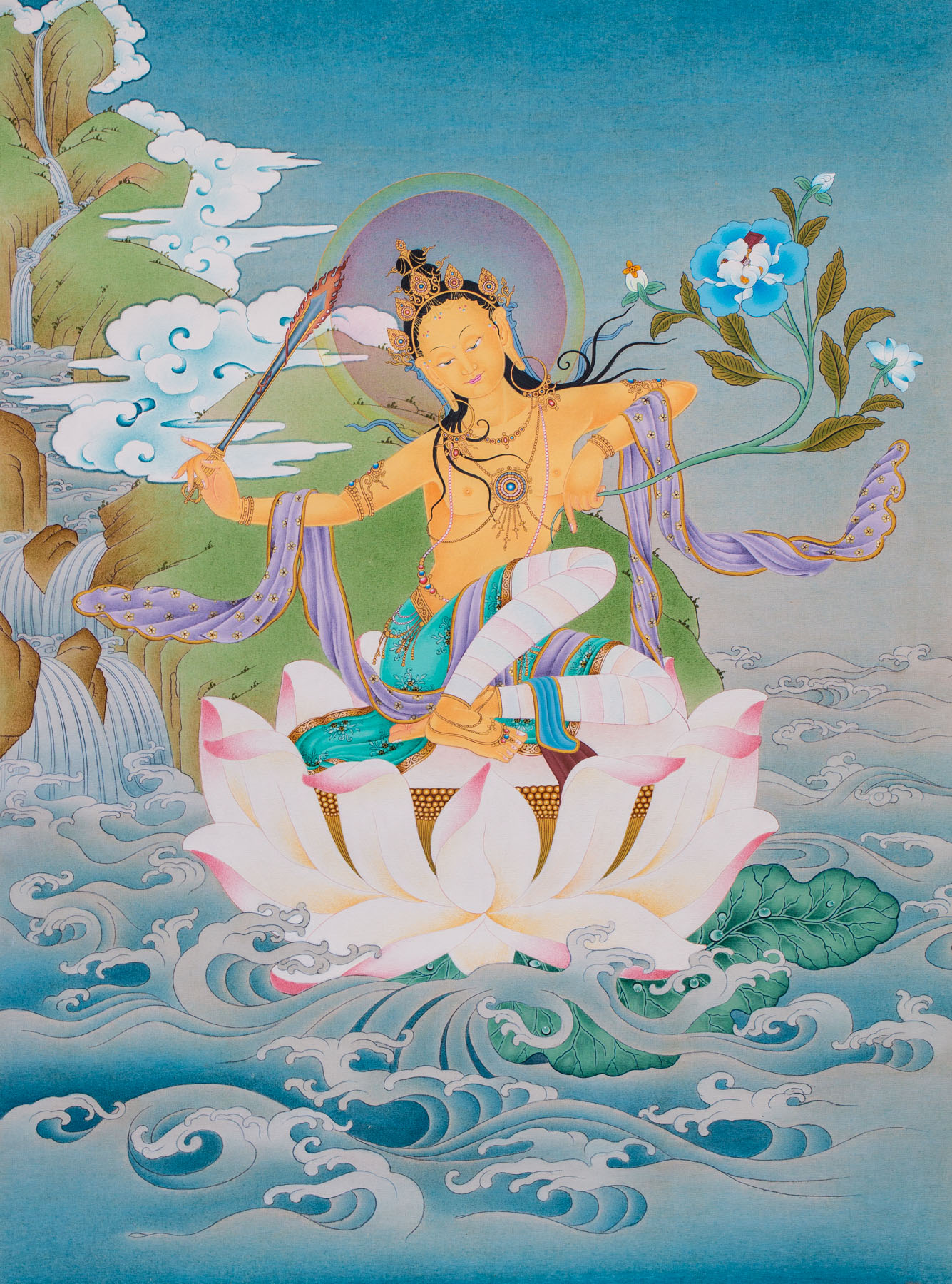 Hai mươi mốt ngày sau khi rời khỏi vương quốc, Hoàng Tử cảm thấy rất khát nước, và đi tìm nước. Ngài tìm thấy một con suối ở giữa rừng, nhưng đúng lúc Ngài sắp uống thì một cô gái xuất hiện và khuyến thỉnh Ngài không nên lấy nước đó bởi vì nước có chất độc. Nàng đưa cho Ngài nước thanh tịnh để uống cho hết khát, và dẫn Ngài tới một đạo sĩ du già sống trong rừng. Vị đạo sĩ này ban gia trì cho Ngài và truyền dạy Ngài giáo pháp. Vị đạo sĩ chính là hóa thân của Đức Văn Thù và cô gái là hóa thân của Đức Tara.