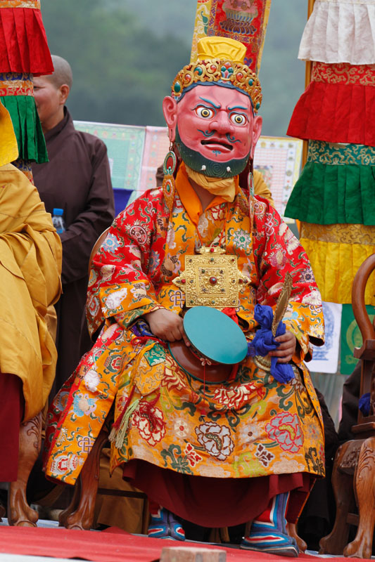 Guru Sengye Drathok, ‘He with the Voice of a Lion’, khoác trên mình y màu xanh, Ngài mang mặt nạ xanh tướng uy mãnh với ba mắt, vương miện đầu lâu, trên tay cầm chày Phổ ba Kim cương. Trong lịch sử Đại học Phật giáo Nalanda (Ấn Độ), có một lần 500 pháp sư huyền thuật đã thách đấu với các học giả trong trường với mục đích hủy hoại Phật pháp. Khi các học giả đang yếu thế trước ngoại đạo, một Dakini đã xuất hiện, dạy cho các vị bài kệ Bảy Lời Cầu Nguyện Đức Liên Hoa Sinh để thỉnh cầu Ngài trợ giúp. Sau đó, Đức Liên Hoa Sinh đã xuất hiện, trợ giúp các học giả Nalanda trong hùng biện cũng như đẩy lùi huyền thuật. Khi các bậc thầy ngoại đạo định dùng phép thuật để sát hại Ngài, Ngài thị hiện thân uy mãnh, đánh tan tà thuật với sấm chớp, rồi phát ra tiếng hống như của sư tử, âm thanh của chân lý tuyệt đối làm thức tỉnh tà kiến bên trong các bậc thầy ngoại đạo.