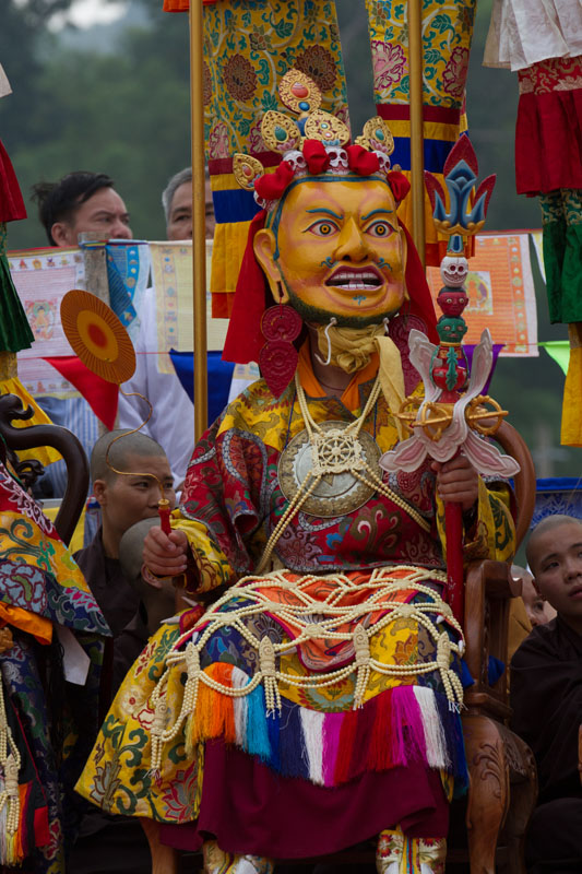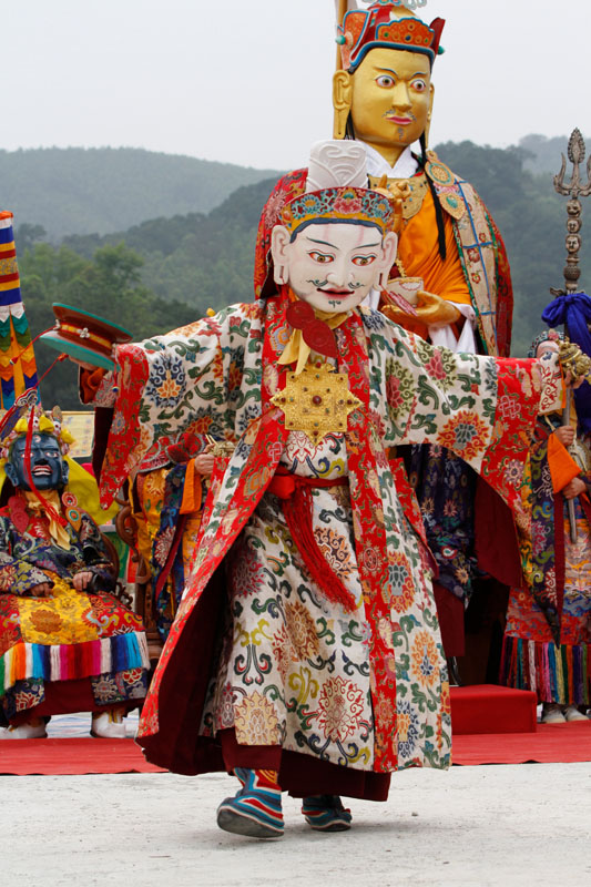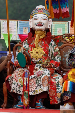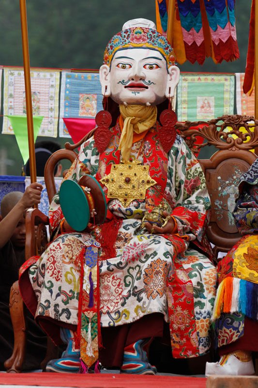 Guru Pema Gyalpo, ‘ Liên Hoa Vương’, Ngài mang mặt nạ trắng, đầu đội vương miện bá vương, trên hai tay Ngài là một chiếc trống và Chuông Kim cương. Trong chuyến thăm quê hương sau khi Ngài thành đạo, vị vua mới của đất nước muốn thiêu chết Ngài nhưng lửa thiêu trong nhiều ngày không tài nào làm hại đức Liên Hoa Sinh. Nhận ra đây là minh chứng cho thành tựu tâm linh của Ngài, họ quy y Phật pháp và cúng dàng ngai vua lên Ngài.