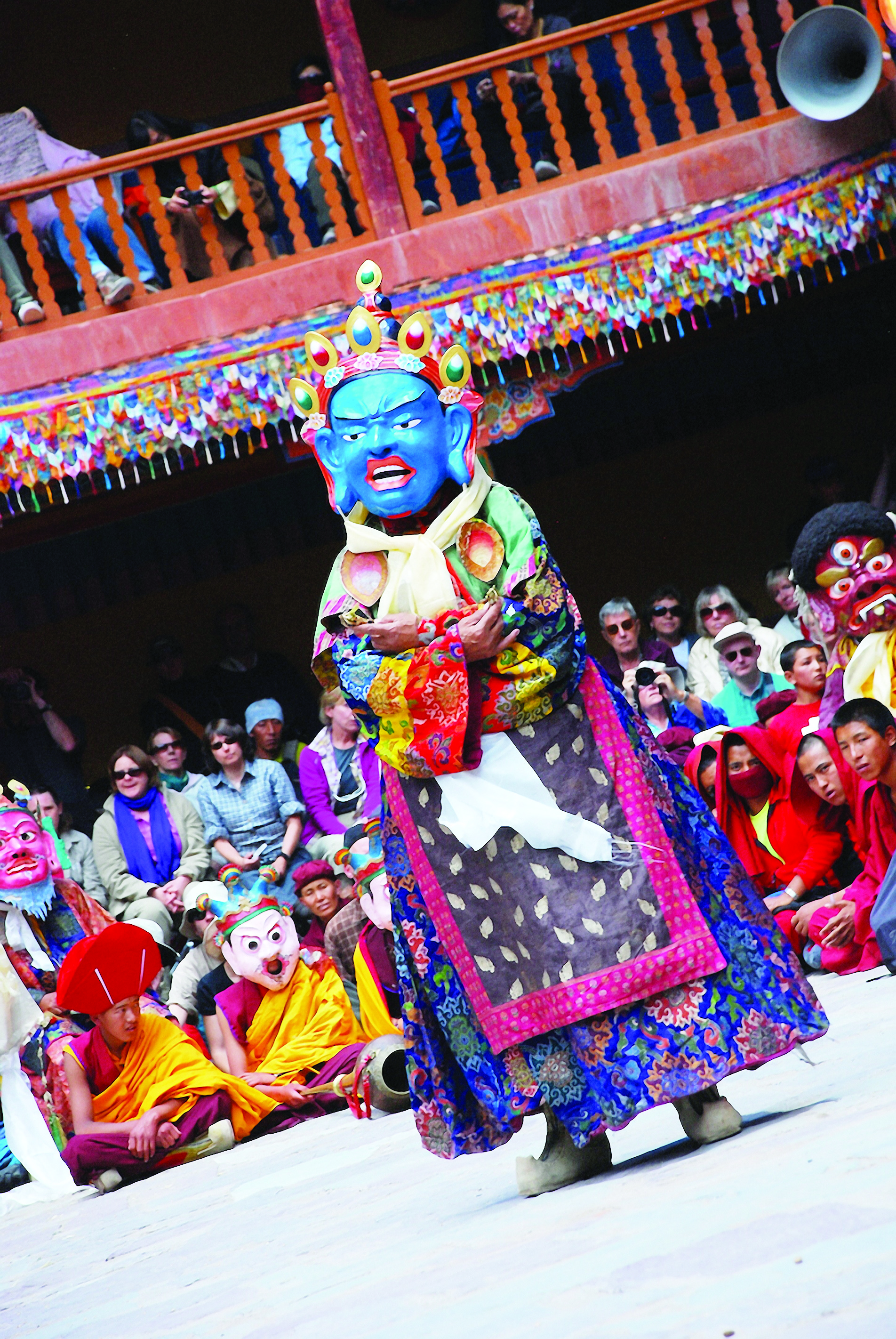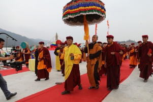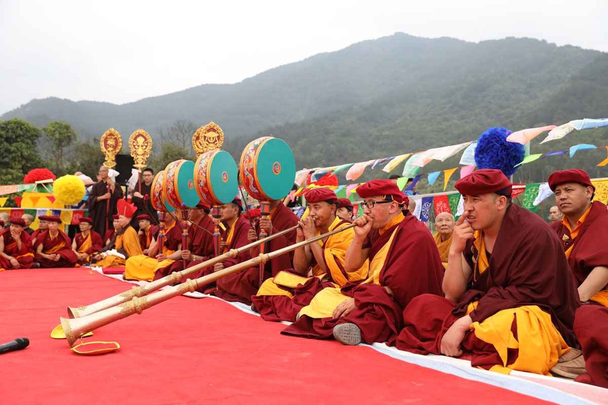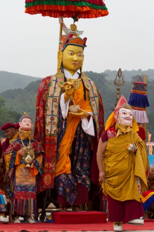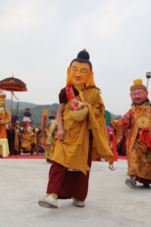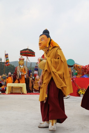 Guru Shakya Sengye, ‘Lion of the Shakya Family’, với chiếc mặt nạ là diện của đức Phật và tóc kết lọn xanh, Ngài mang trên mình Tăng phục màu vàng, trên tay Ngài là bình bát. Đức Liên Hoa Sinh được kính ngưỡng là một hóa thân của đức Phật Thích Ca Mâu Ni, và cũng giống như đức Phật Thích Ca, khi còn là Thái tử thừa kế ngôi vua, Ngài đã xả ly tất cả vinh hoa phú quý, thực hành thiền định tại nhiều nơi để đạt giác ngộ giải thoát và có thể cứu độ chúng sinh. Trong hóa thân này, dù đã là một bậc giác ngộ từ khi đản sinh, Ngài vẫn lấy thân mình làm gương cho chúng sinh, thọ nhận giới phẩm và qua đó nhận Truyền thừa bắt nguồn từ Đức Phật, thực hành giới, định, tuệ để đạt giác ngộ, hoằng truyền giáo pháp cứu độ chúng sinh. Những chân lý vũ trụ được Ngài tuyên thuyết được ví như tiếng hống của sư tử, đánh thức chúng sinh khỏi giấc ngủ mê trong vô minh.